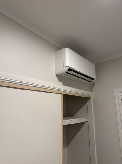 A white split system air conditioning unit mounted high on a bedroom wall above a built-in wardrobe.