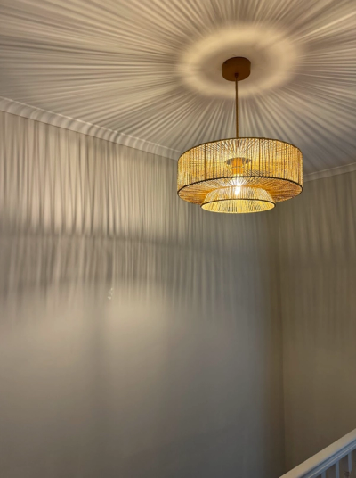 A woven-style ceiling pendant casting beautiful radial light patterns across the ceiling and stairwell walls.