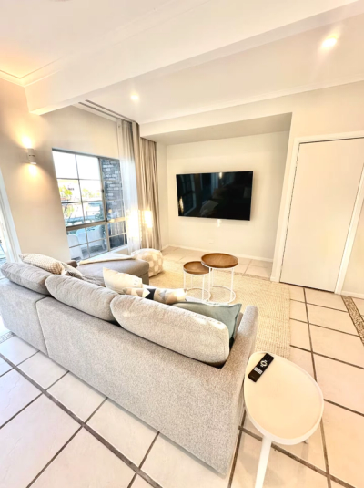 Contemporary Airbnb living room featuring a wall-mounted smart TV, LED downlights, wall sconces, and soft furnishings.
