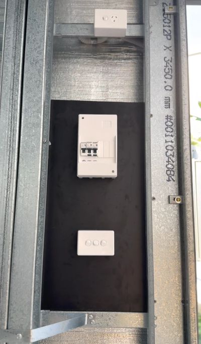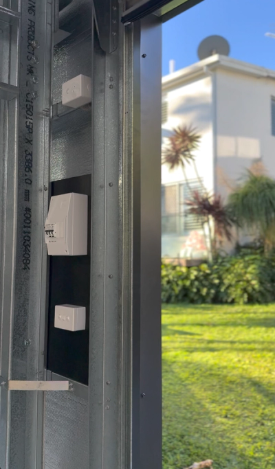 A tidy and future-proof install at the shed’s entrance—everything centralised for easy access and control